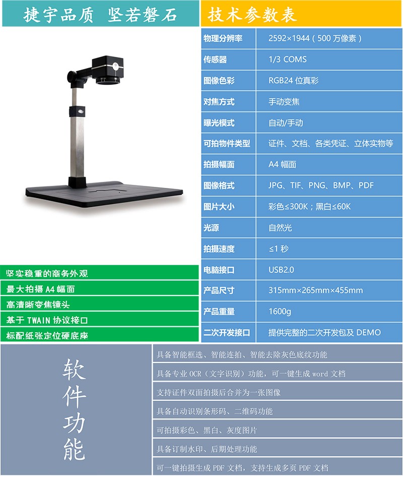 “捷宇”品牌的高拍儀產品可以完全取代傳統平板掃描儀,除了在各項性能指標上優于傳統掃描儀之外,更具備了體積小、無機械損耗、不用外接電源等傳統掃描儀無法實現的優點!