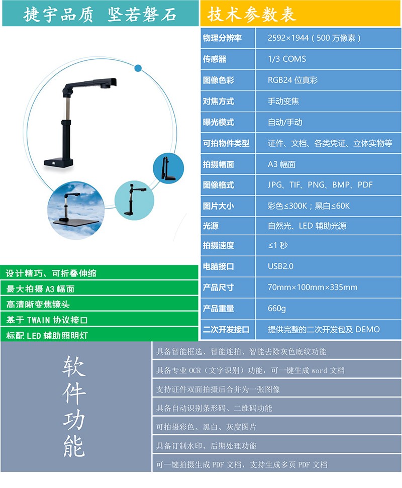 “捷易拍”品牌的高拍儀產品可以完全取代傳統平板掃描儀,除了在各項性能指標上優于傳統掃描儀之外,更具備了體積小、無機械損耗、不用外接電源等傳統掃描儀無法實現的優點!