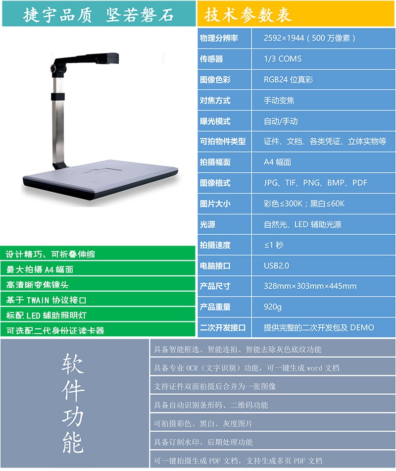 “捷宇”品牌的高拍儀產品集成了高速文檔拍攝技術、OCR光學智能識別技術、自動目錄存儲技術等當今最熱門的技術,迅速、準確地將大量有價值的紙張信息數字化,并有效的存儲起來,加以配合各行業使用的影像管理系統,能大大推動辦公領域的文檔數字信息化進程。