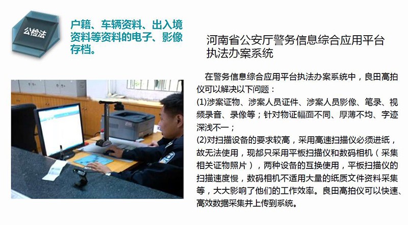 高拍儀產品為我司第一家發明的低碳辦公產品,具有自主知識產權和獨家專利。產品獨創折疊式的超便捷設計,能完成一秒鐘高速掃描,具有OCR文字識別功能,可以將掃描的圖片識別轉換成可編輯的word文檔。它還能進行拍照、錄像、復印、網絡無紙傳真等操作。由于采用“硬件+軟件”的設計理念,使得其可以滿足不同行業、不同應用場景的需要。