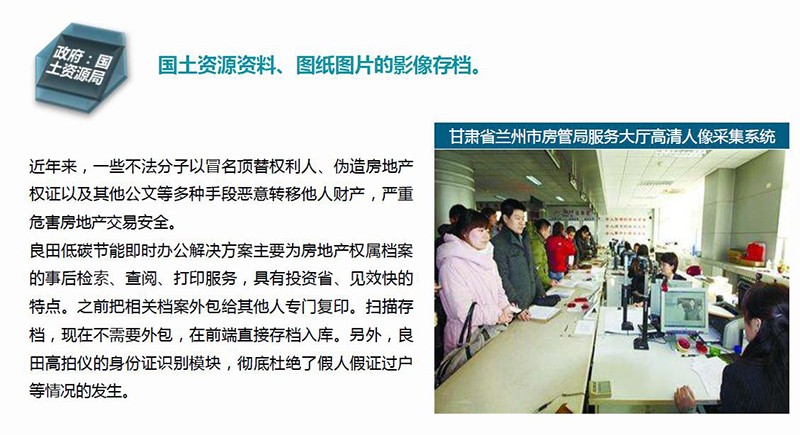 目前,良田高拍儀已經成為高拍儀行業標準,是當之無愧的高拍儀新品類創立者。2010年底,良田高拍儀已服務于40%以上的銀行保險企業,4大國有銀行采用率為80%,300多家"211"高校和全國重點中小學,并規模服務于政府單位,教育、醫療等機構。2012年市場占有率達到56%。