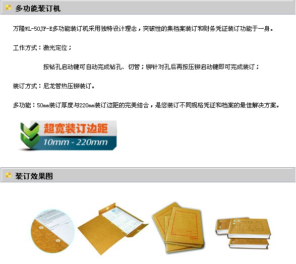 1、多功能:萬隆藍寶WL-50JF-E多用途裝訂機采用獨特設計理念,突破性地集檔案裝訂和財務憑證裝訂功能于一身。